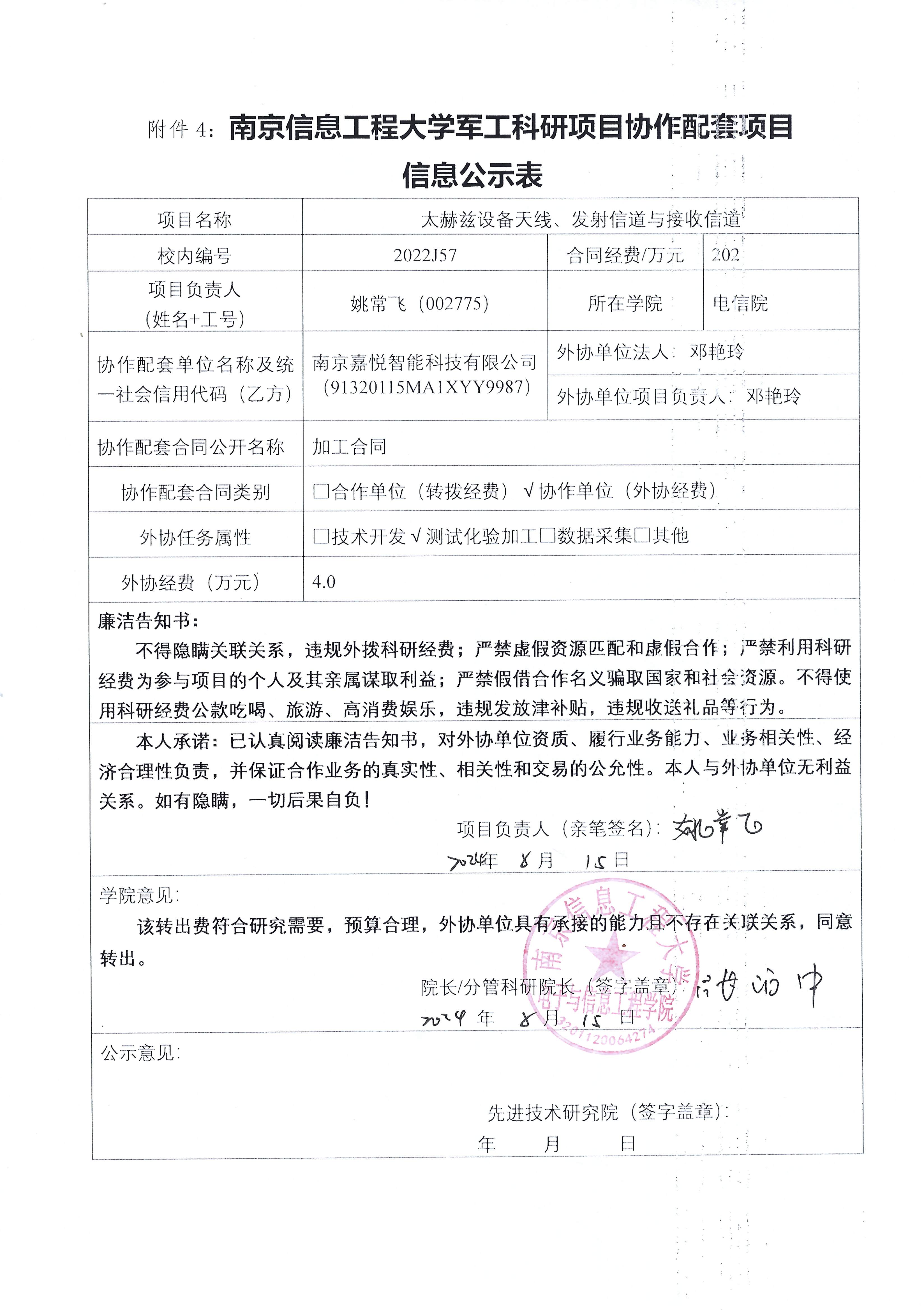 根据《中共教育部党组关于抓好赋予科研管理更大自主权有关文件贯彻落实工作的通知》(教党函〔2019〕37号)、《南京信息工程大学理工科纵向科研经费管理办法》(校发〔2019〕21号)、《南京信息工程大学理工科纵向科研项目管理办法》(校发〔2024〕142号)相关规定,现对电子与信息工程学院姚常飞教师军工项目(2022J57)的外协经费情况进行公示。公示时间:2024年8月15日至2024年8月21日。