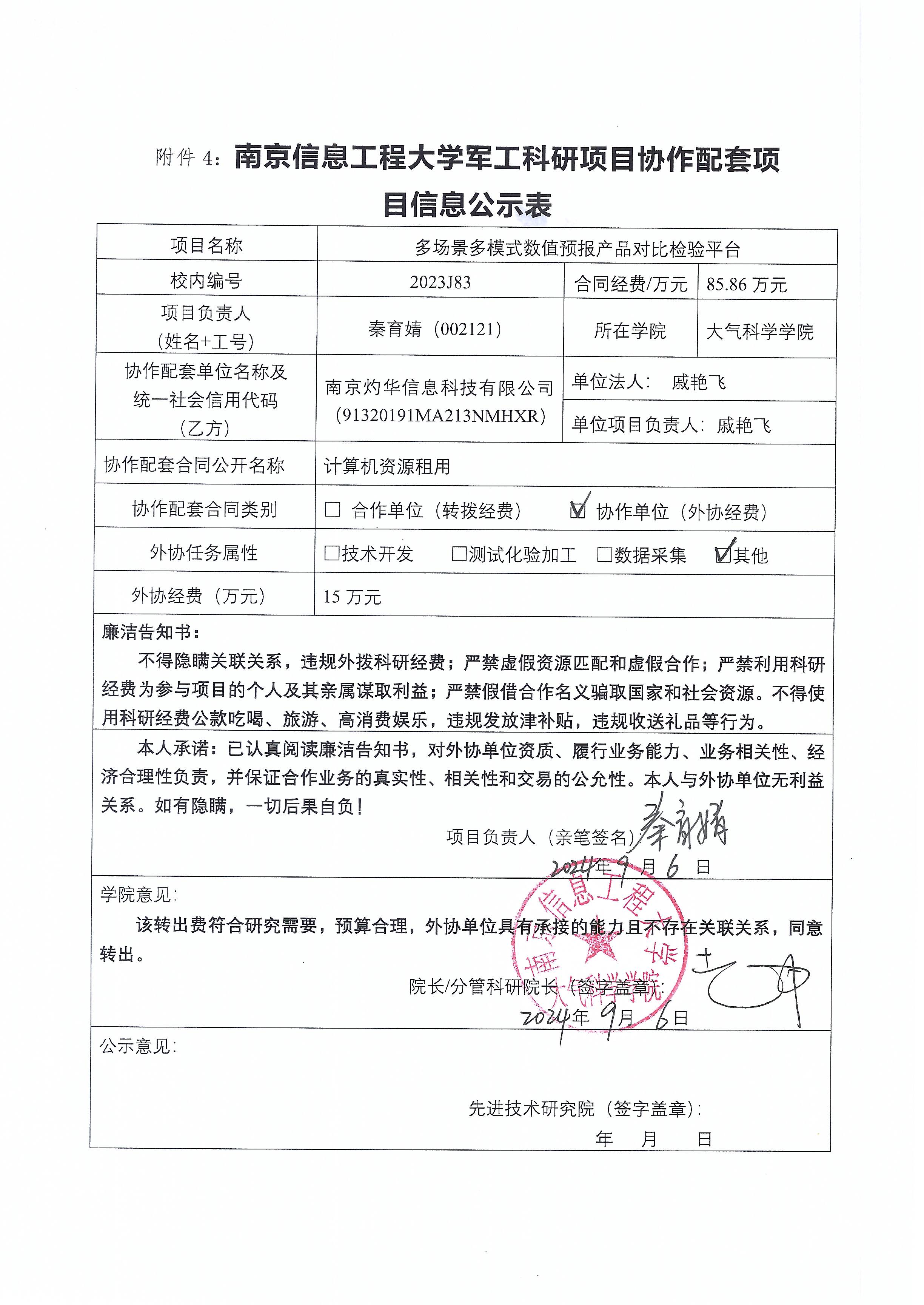根据《中共教育部党组关于抓好赋予科研管理更大自主权有关文件贯彻落实工作的通知》(教党函〔2019〕37号)、《南京信息工程大学理工科纵向科研经费管理办法》(校发〔2019〕21号)、《南京信息工程大学理工科纵向科研项目管理办法》(校发〔2024〕142号)相关规定,现对大气科学学院秦育婧教师军工项目(2023J83)的外协经费情况进行公示。公示时间:2024年9月6日至2024年9月12日