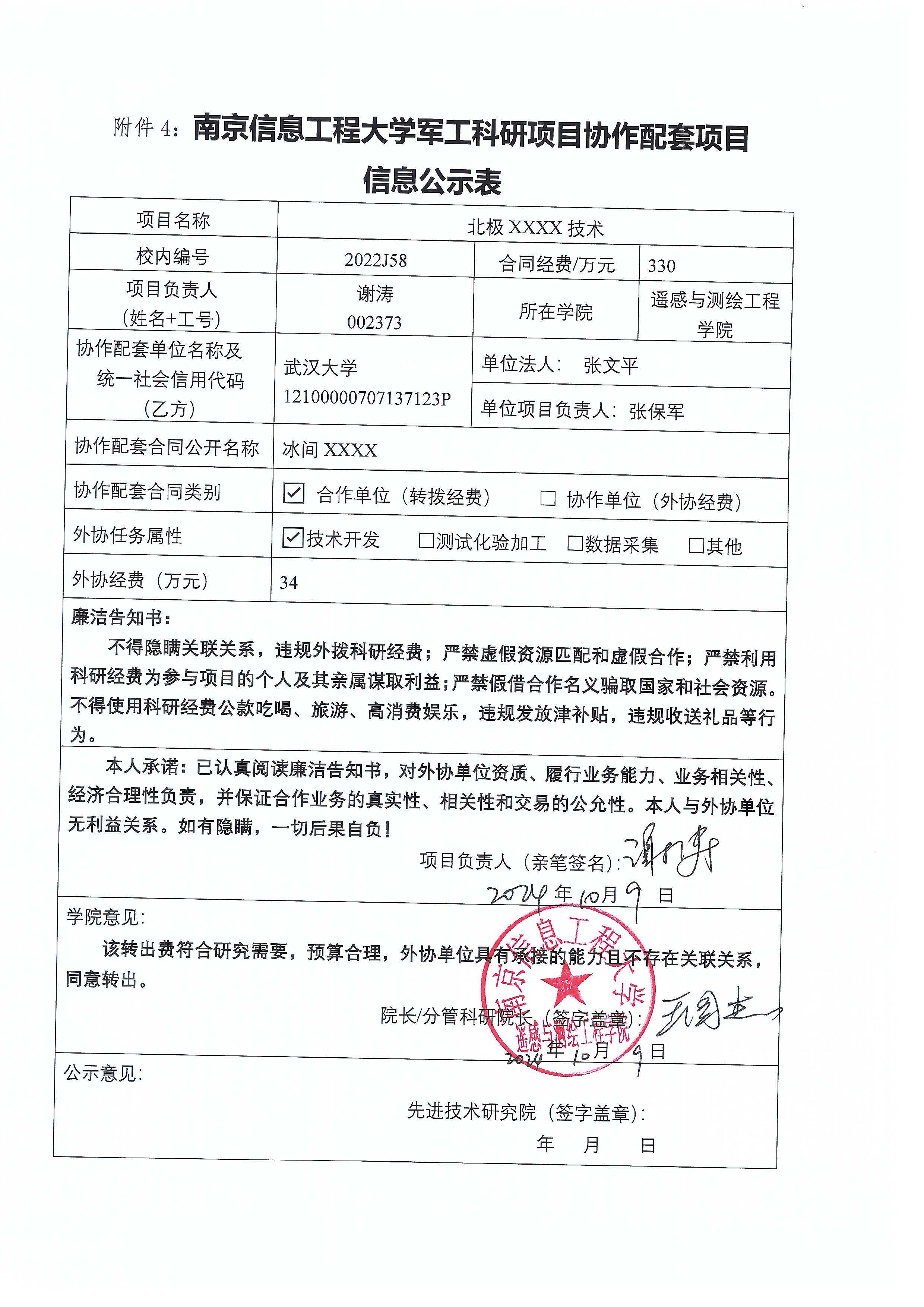 根据《中共教育部党组关于抓好赋予科研管理更大自主权有关文件贯彻落实工作的通知》(教党函〔2019〕37号)、《南京信息工程大学理工科纵向科研经费管理办法》(校发〔2019〕21号)、《南京信息工程大学理工科纵向科研项目管理办法》(校发〔2024〕142号)相关规定,现对遥感与测绘工程学院谢涛教师军工项目(2022J58)的外协经费情况进行公示。公示时间:2024年10月9日至2024年10月15日。