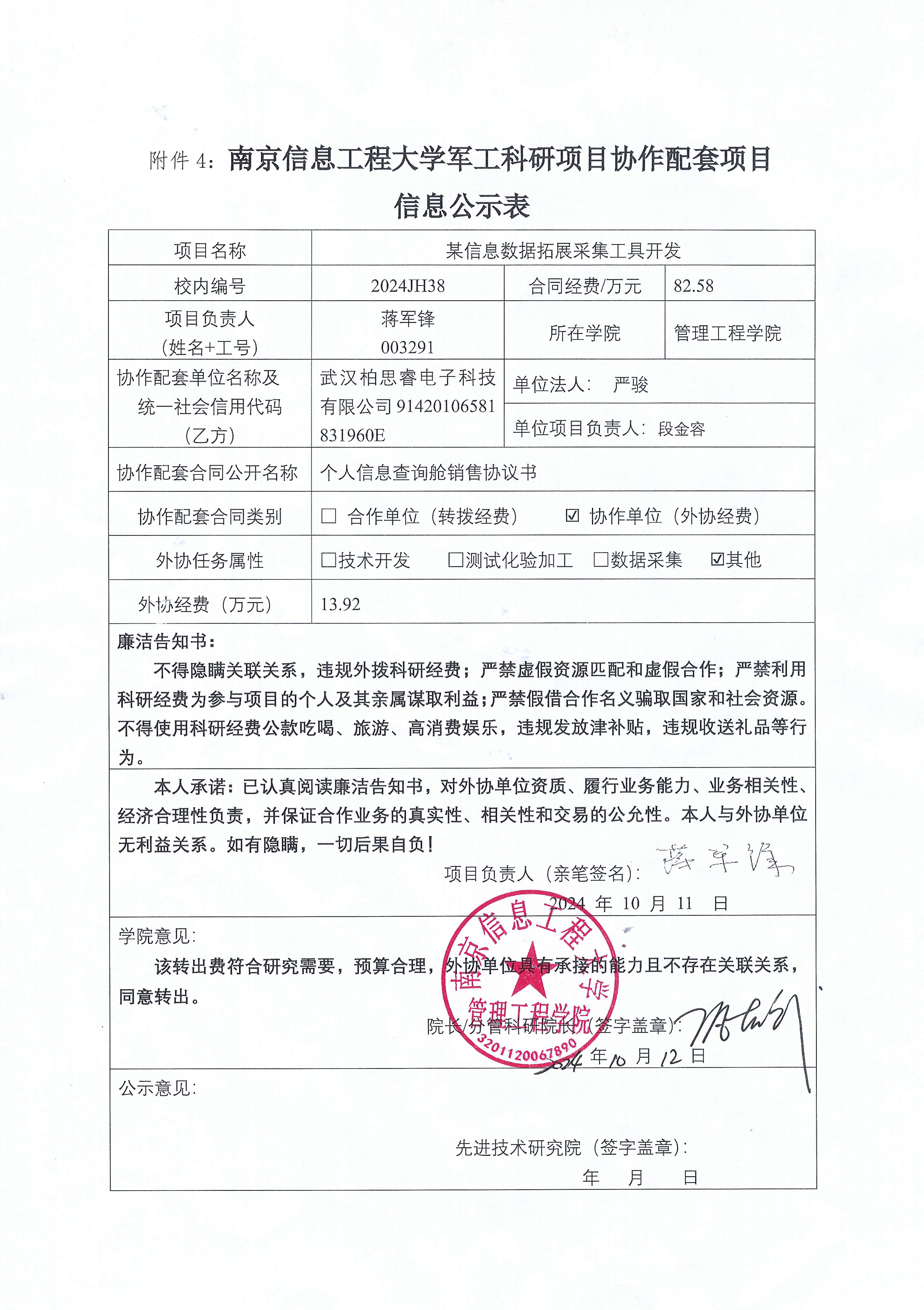根据《中共教育部党组关于抓好赋予科研管理更大自主权有关文件贯彻落实工作的通知》(教党函〔2019〕37号)、《南京信息工程大学理工科纵向科研经费管理办法》(校发〔2019〕21号)、《南京信息工程大学理工科纵向科研项目管理办法》(校发〔2024〕142号)相关规定,现对管理工程学院蒋军锋教师军工项目(2024JH38)的外协经费情况进行公示。公示时间:2024年10月14日至2024年10月18日。