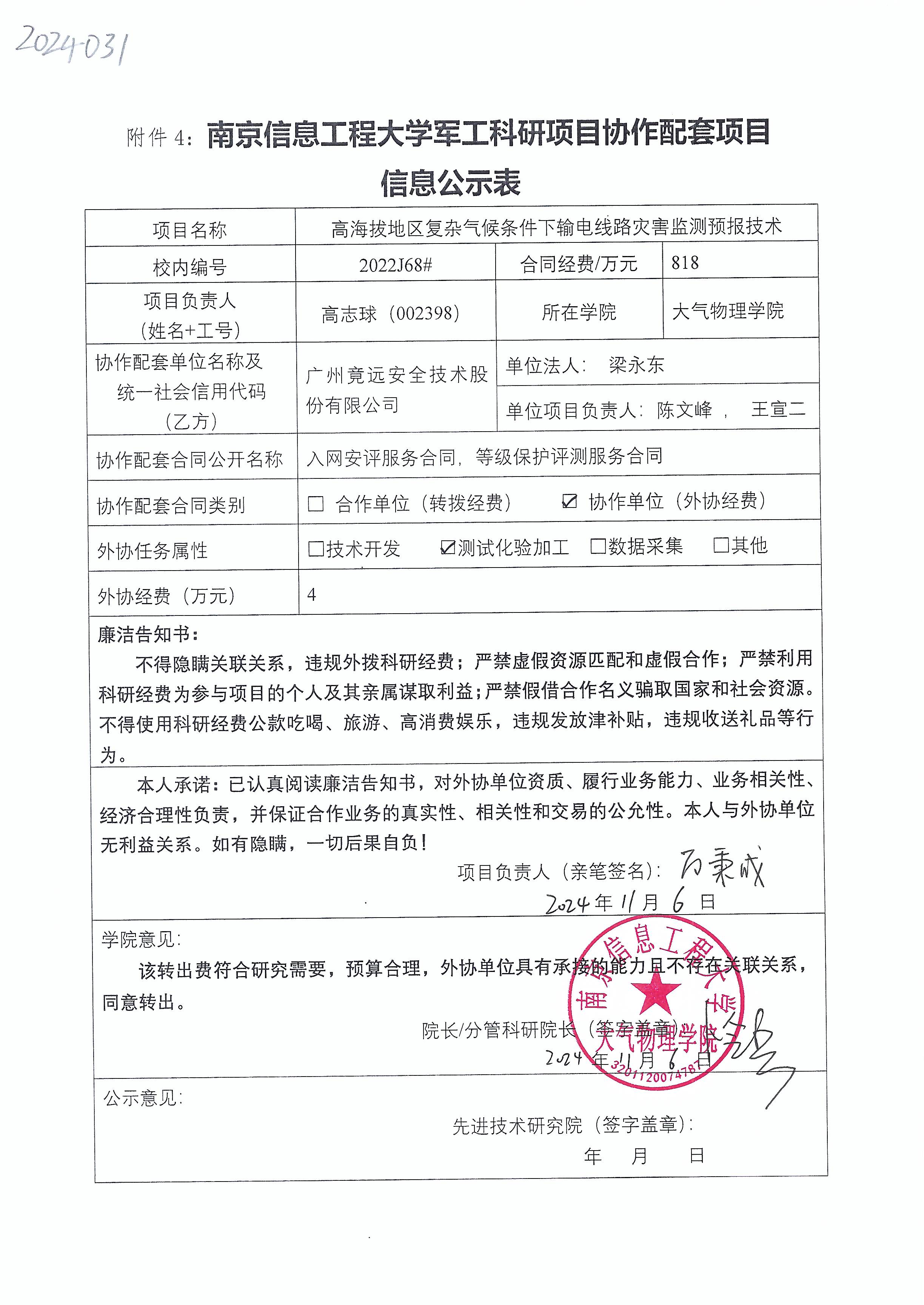 根据《中共教育部党组关于抓好赋予科研管理更大自主权有关文件贯彻落实工作的通知》(教党函〔2019〕37号)、《南京信息工程大学理工科纵向科研经费管理办法》(校发〔2019〕21号)、《南京信息工程大学理工科纵向科研项目管理办法》(校发〔2024〕142号)相关规定,现对大气物理学院高志球教师军工项目(2022J68)的外协经费情况进行公示。公示时间:2024年11月6日至2024年11月13日。