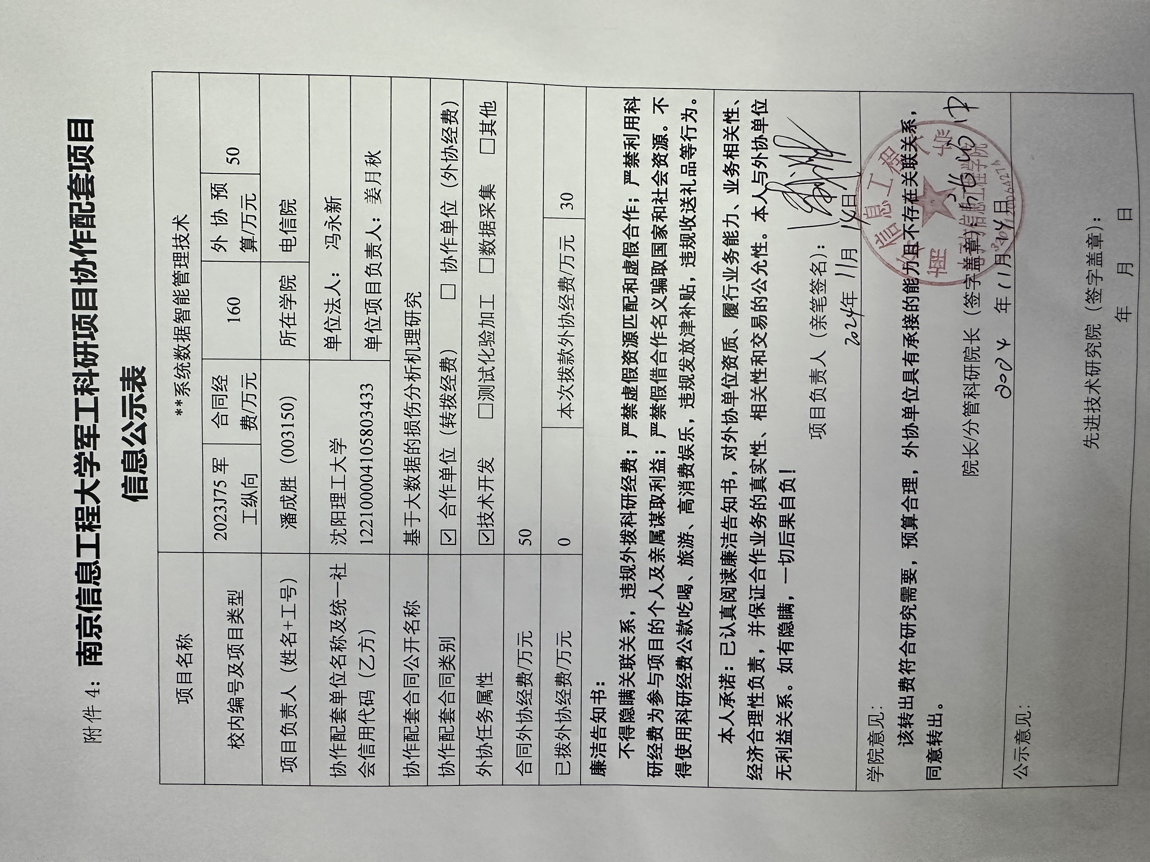 根据《中共教育部党组关于抓好赋予科研管理更大自主权有关文件贯彻落实工作的通知》(教党函〔2019〕37号)、《南京信息工程大学理工科纵向科研经费管理办法》(校发〔2019〕21号)、《南京信息工程大学理工科纵向科研项目管理办法》(校发〔2024〕142号)相关规定,现对电信院潘成胜老师军工项目(2023J75)的外协经费情况进行公示。公示时间:2024年11月14日至2024年9月20日
