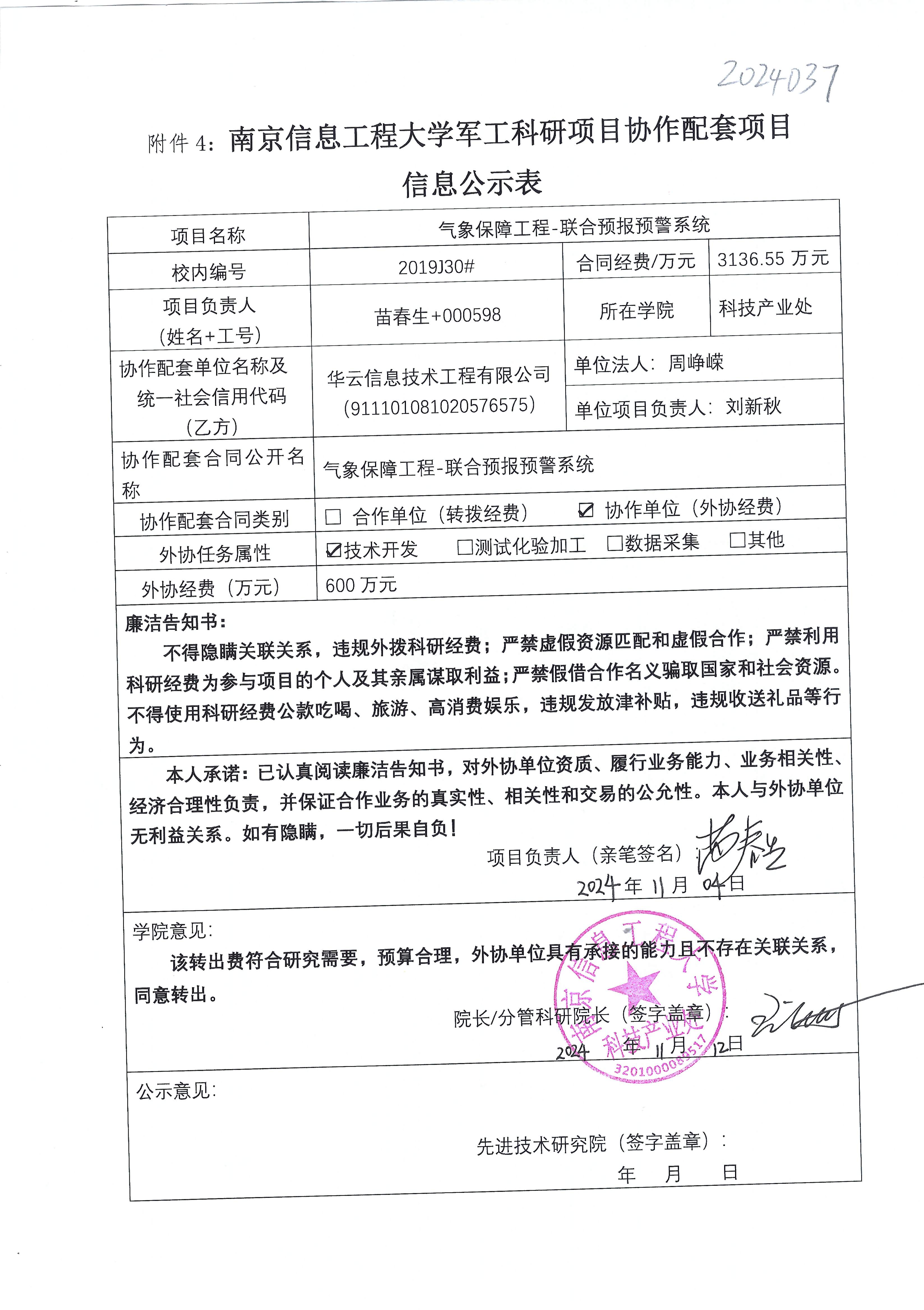 根据《中共教育部党组关于抓好赋予科研管理更大自主权有关文件贯彻落实工作的通知》(教党函〔2019〕37号)、《南京信息工程大学理工科纵向科研经费管理办法》(校发〔2019〕21号)、《南京信息工程大学理工科纵向科研项目管理办法》(校发〔2024〕142号)相关规定,现对大气科学学院苗春生教师军工项目(2019J30)的外协经费情况进行公示。公示时间:2024年11月20日至2024年11月27日。