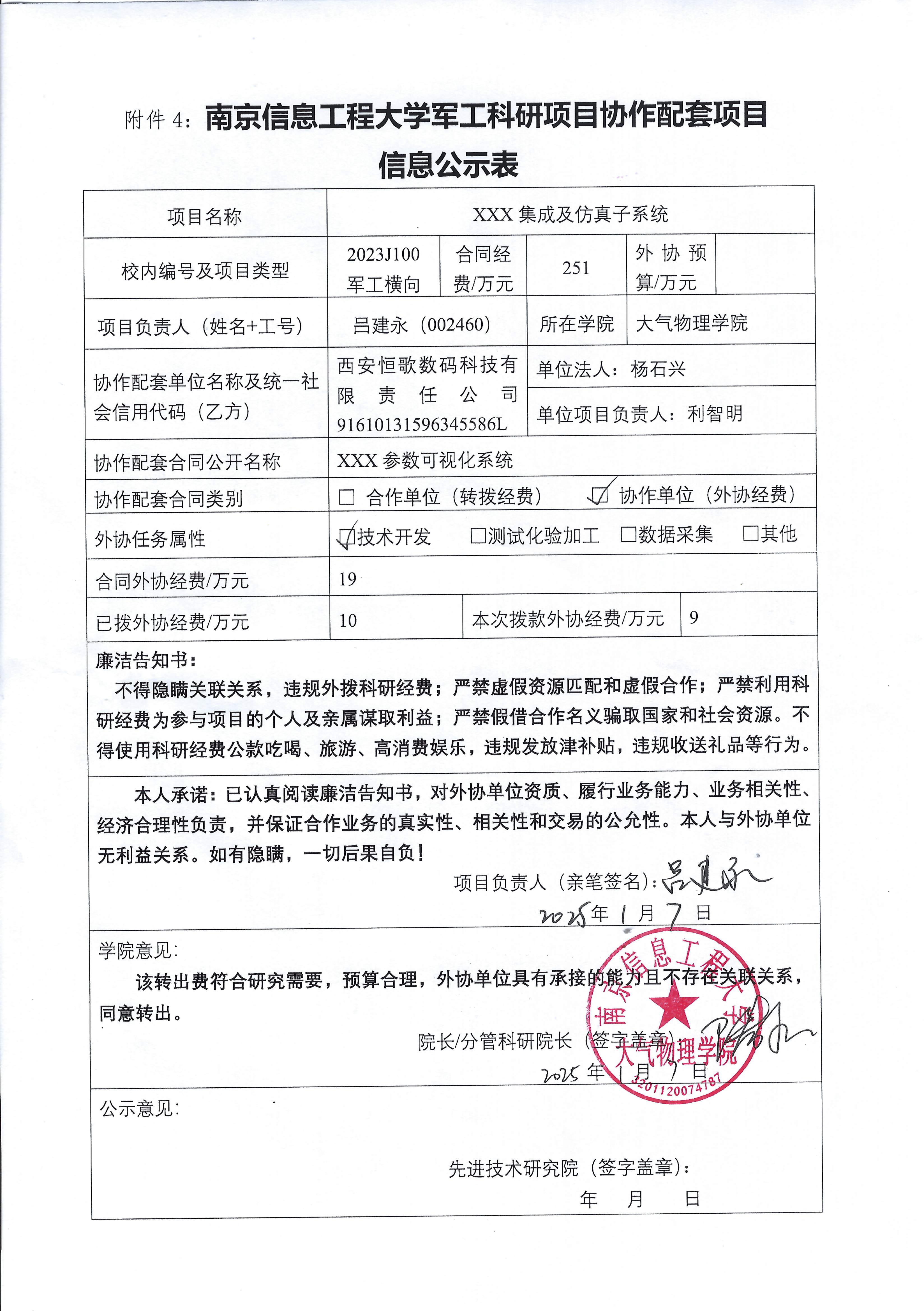 根据《中共教育部党组关于抓好赋予科研管理更大自主权有关文件贯彻落实工作的通知》(教党函〔2019〕37号)、《南京信息工程大学理工科纵向科研经费管理办法》(校发〔2019〕21号)、《南京信息工程大学理工科纵向科研项目管理办法》(校发〔2024〕142号)相关规定,现对大气物理学院吕建永教师军工项目(2023J100)的外协经费情况进行公示。公示时间:2025年1月9日至2025年1月16日。