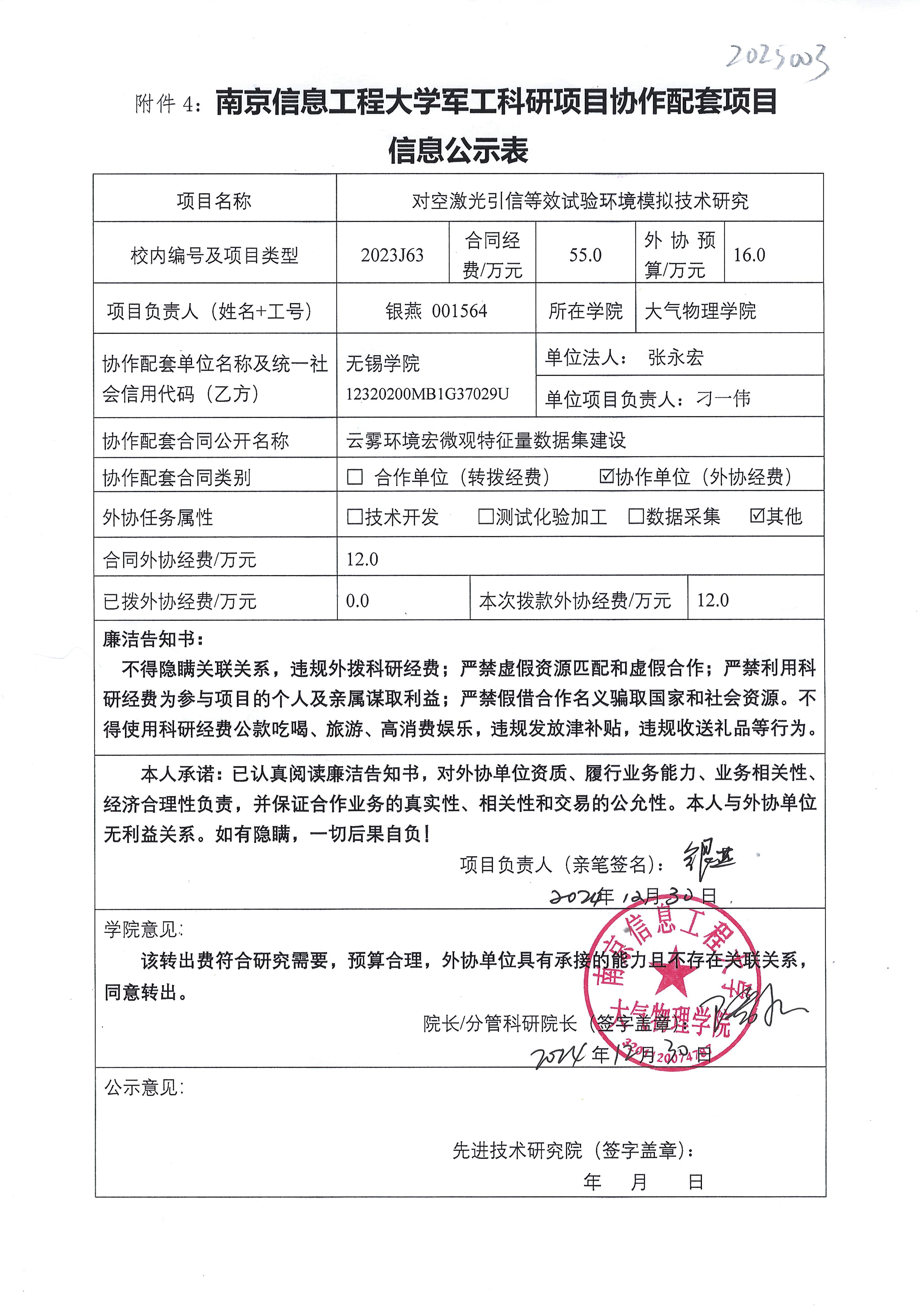 根据《中共教育部党组关于抓好赋予科研管理更大自主权有关文件贯彻落实工作的通知》(教党函〔2019〕37号)、《南京信息工程大学理工科纵向科研经费管理办法》(校发〔2019〕21号)、《南京信息工程大学理工科纵向科研项目管理办法》(校发〔2024〕142号)相关规定,现对大气物理学院银燕教师军工项目(2023J63)的外协经费情况进行公示。公示时间:2025年1月10日至2025年1月17日。