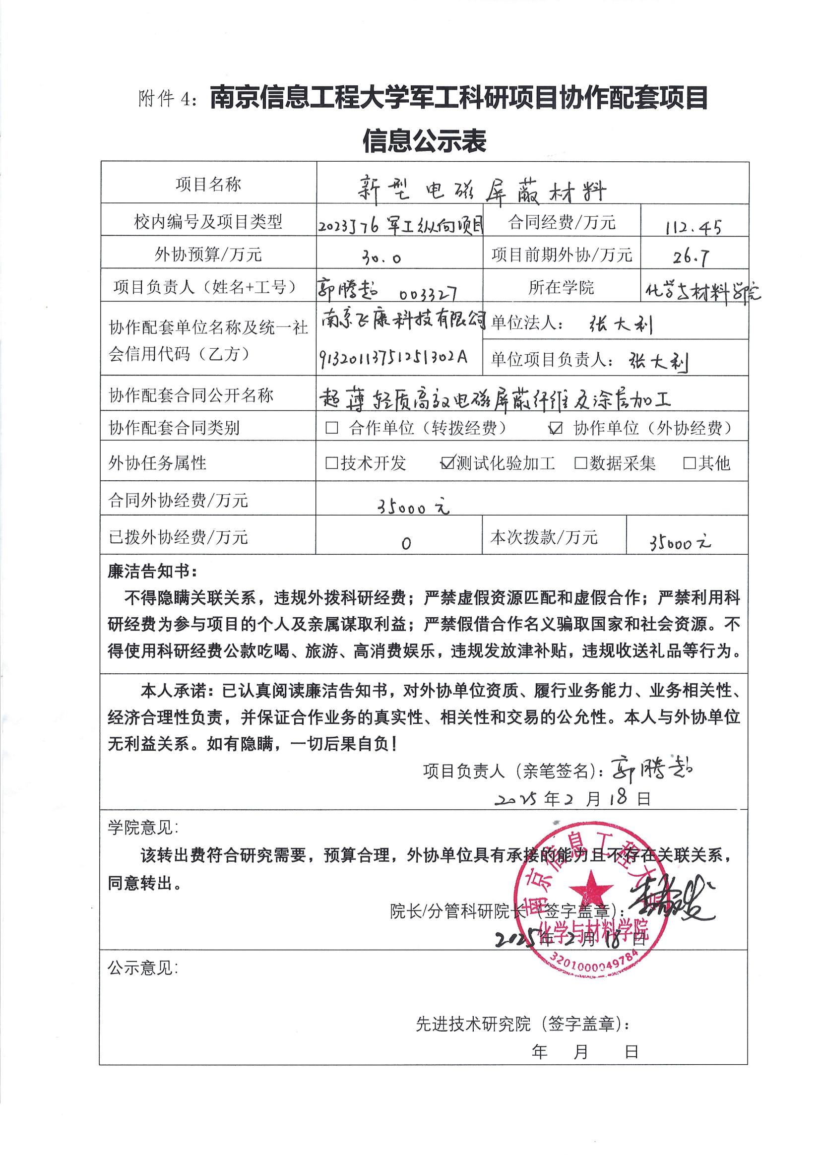 根据《中共教育部党组关于抓好赋予科研管理更大自主权有关文件贯彻落实工作的通知》(教党函〔2019〕37号)、《南京信息工程大学理工科纵向科研经费管理办法》(校发〔2019〕21号)、《南京信息工程大学理工科纵向科研项目管理办法》(校发〔2024〕142号)相关规定,现对化学与材料学院郭腾超教师军工项目(2023J76)的外协经费情况进行公示。公示时间:2025年2月18日至2025年2月24日。