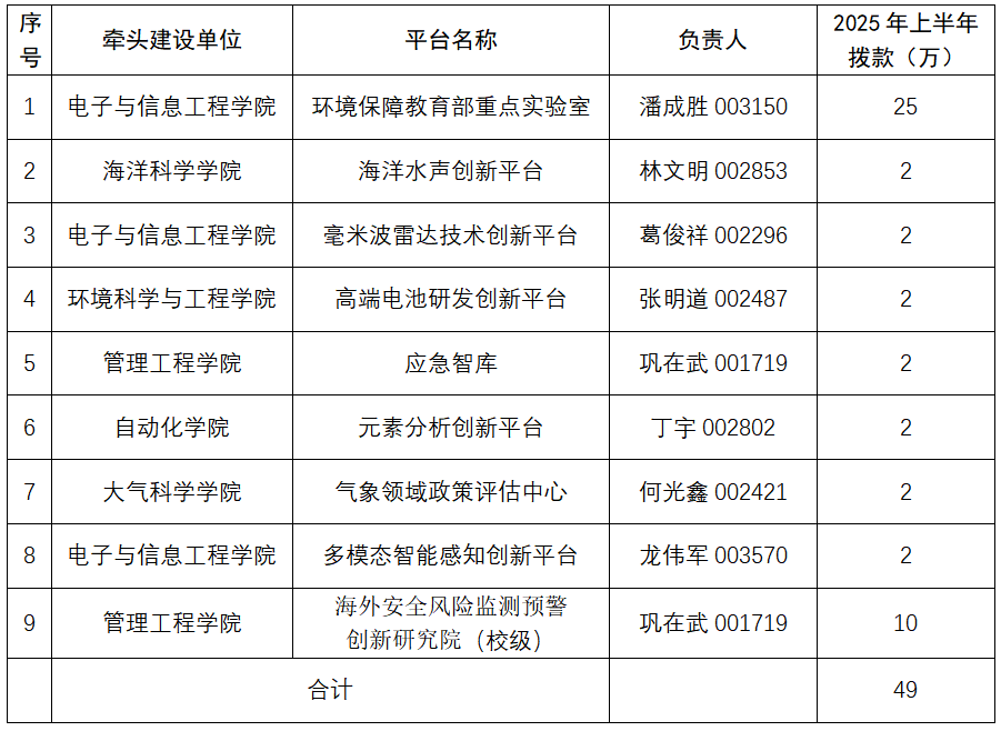 根据《南京信息工程大学科研平台管理办法(自然科学类)(试行)》(校发〔2023〕12号)规定要求,按照学校批准的部门经费支出预算,拟拨付8个省部级军工科研平台以及1个校级科研平台2025年上半年运行经费,合计49万元。详细分配情况如下表。