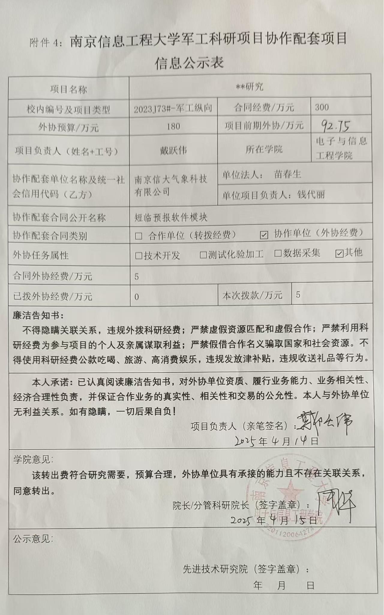 根据《南京信息工程大学理工科纵向科研经费管理办法》(校发〔2019〕21号)、《南京信息工程大学理工科纵向科研项目管理办法》(校发〔2024〕142号)、《南京信息工程大学理工类横向科研项目及经费管理办法(试行)》(校发〔2021〕60号)和我校科研项目外协经费管理要求,现对电信学院戴跃伟教师军工项目(2023J73)的拟外协项目有关情况进行公示。公示时间:2025年4月18日至2025年4月24日。