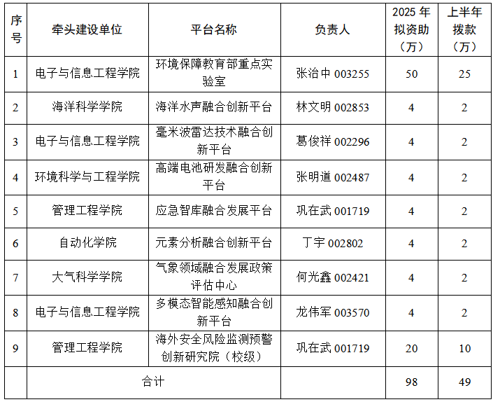 根据《南京信息工程大学科研平台管理办法(自然科学类)(试行)》(校发〔2023〕12号)规定要求,按照学校批准的部门经费支出预算,拟拨付8个省部级军工科研平台以及1个校级科研平台2025年下半年运行经费,合计49万元。详细分配情况如下表。