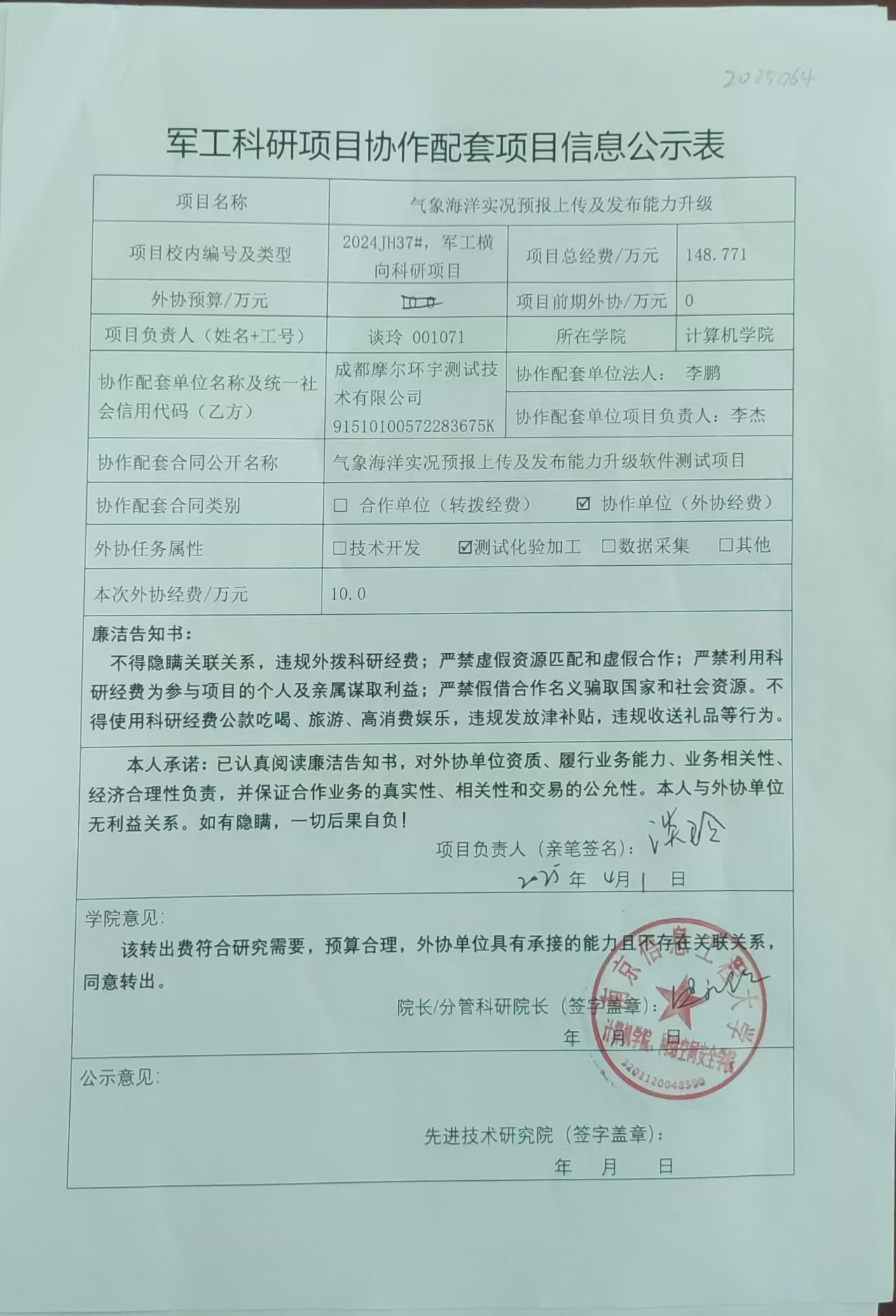 根据《南京信息工程大学科研经费管理办法(修订)》(校发〔2025〕66号)、《南京信息工程大学理工科纵向科研经费管理办法》(校发〔2019〕21号)、《南京信息工程大学理工科纵向科研项目管理办法》(校发〔2024〕142号)、《南京信息工程大学理工类横向科研项目及经费管理办法(试行)》(校发〔2021〕60号)和我校科研项目外协经费管理要求,现对计算机学院谈玲教师军工项目(2024JH37)的拟外协项目有关情况进行公示。公示时间:2025年9月11日至2025年9月18日。