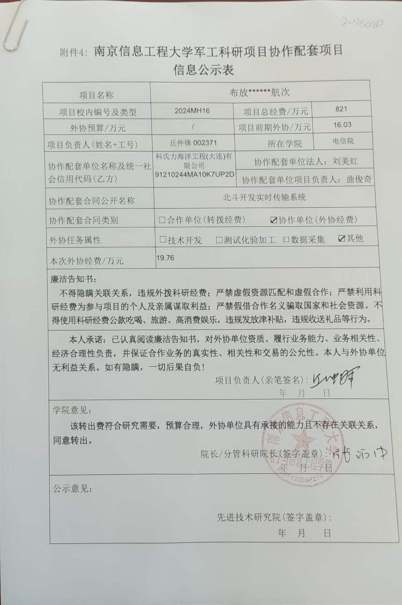 根据《南京信息工程大学科研经费管理办法(修订)》(校发〔2025〕66号)、《南京信息工程大学科研项目及经费管理办法》(校发〔2025〕81号)和我校科研项目外协经费管理要求,现对电信学院丘仲峰教师军工项目(2024MH16)的拟外协项目有关情况进行公示。公示时间:2025年10月24日至2025年10月31日。