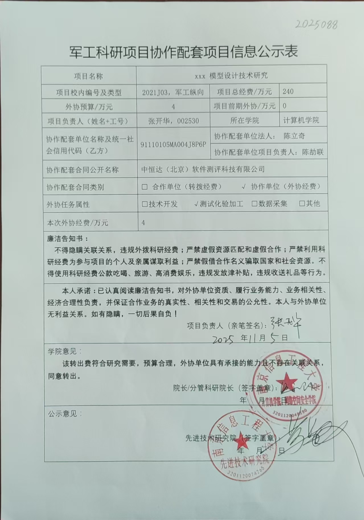 根据《南京信息工程大学科研经费管理办法(修订)》(校发〔2025〕66号)、《南京信息工程大学科研项目及经费管理办法》(校发〔2025〕81号)和我校科研项目外协经费管理要求,现对计算机学院张开华教师军工项目(2021J03)的拟外协项目有关情况进行公示。公示时间:2025年11月6日至2025年11月13日。