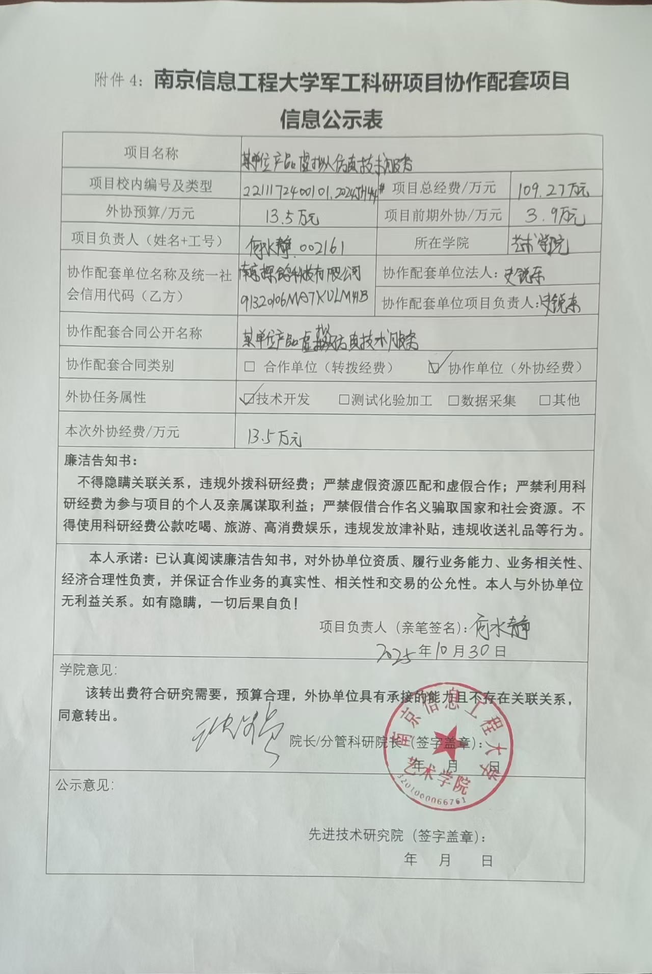 根据《南京信息工程大学科研经费管理办法(修订)》(校发〔2025〕66号)、《南京信息工程大学科研项目及经费管理办法》(校发〔2025〕81号)和我校科研项目外协经费管理要求,现对艺术学院何水静教师军工项目(2024JH44)的拟外协项目有关情况进行公示。公示时间:2025年11月24日至2025年12月1日。