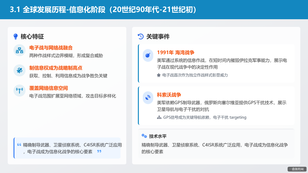 关键事件:1991 年海湾战争,美军通过系统的信息作战,在短时间内摧毁伊拉克军事能力;科索沃战争中,美军依赖 GPS 制导武器,俄罗斯向塞尔维亚提供 GPS 干扰技术