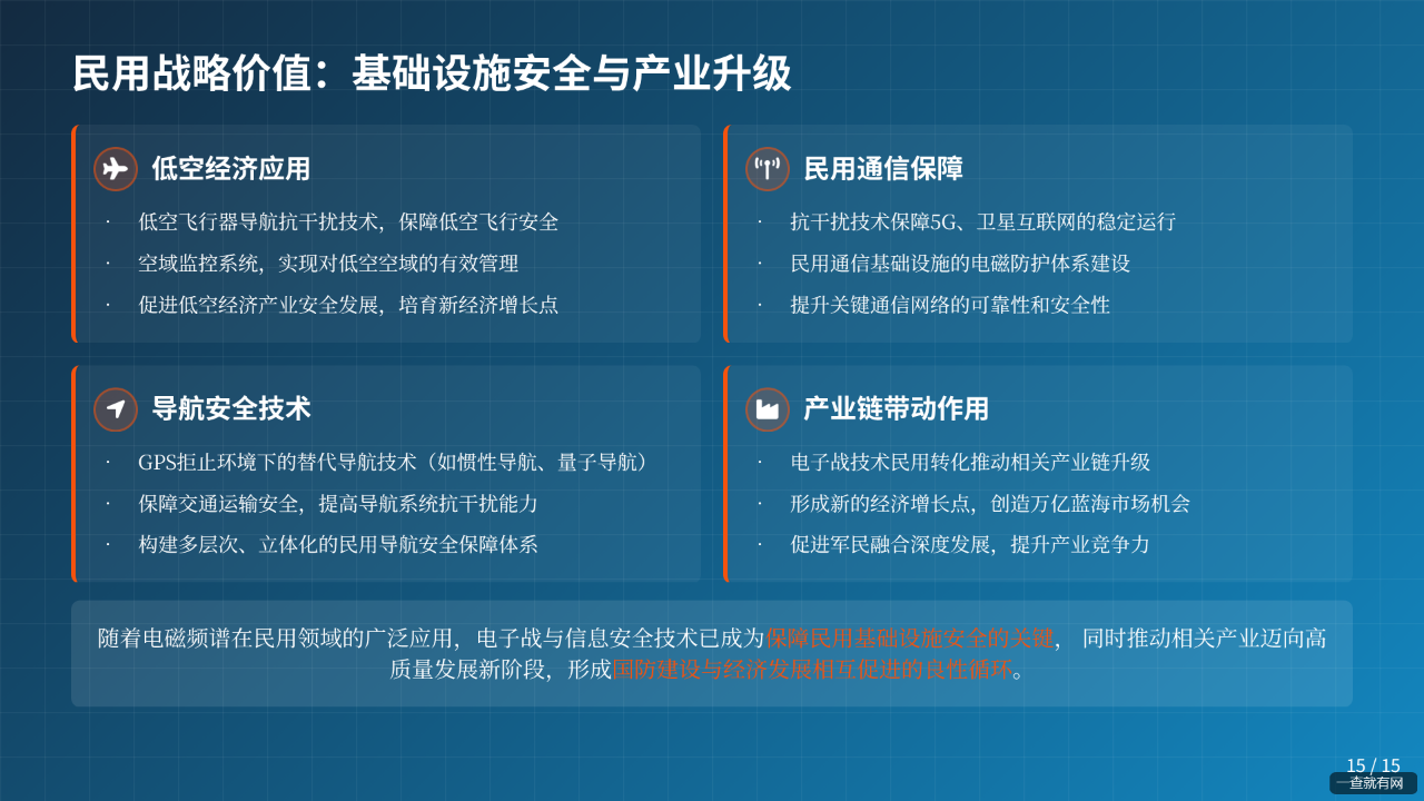 随着电磁频谱在民用领域的广泛应用,电子战与信息安全技术已成为保障民用基础设施安全的关键。在低空经济领域,电子战技术用于低空飞行器的导航抗干扰、空域监控;在民用通信领域,抗干扰技术保障 5G、卫星互联网的稳定运行;在导航领域,GPS 拒止环境下的替代导航技术(如惯性导航、量子导航)保障交通运输安全(《20241222 - 国盛证券 - 国防军工行业 2025 年度策略:否极泰来,军工春天已来.pdf》)。此外,电子战技术的民用转化还能推动相关产业链升级,形成新的经济增长点(《低空经济:产业元年来临,万亿蓝海赛道腾飞》,《20241222 - 国盛证券 - 国防军工行业 2025 年度策略:否极泰来,军工春天已来.pdf》)。