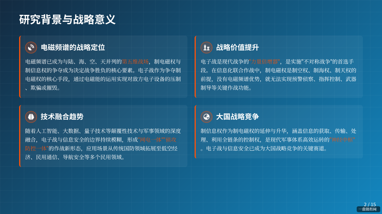 本报告基于一查就有知识库,系统梳理电子战与信息安全行业的核心内涵、发展历程、技术体系、产业链格局、应用场景及未来趋势,为行业研究、技术研发及战略决策提供参考。