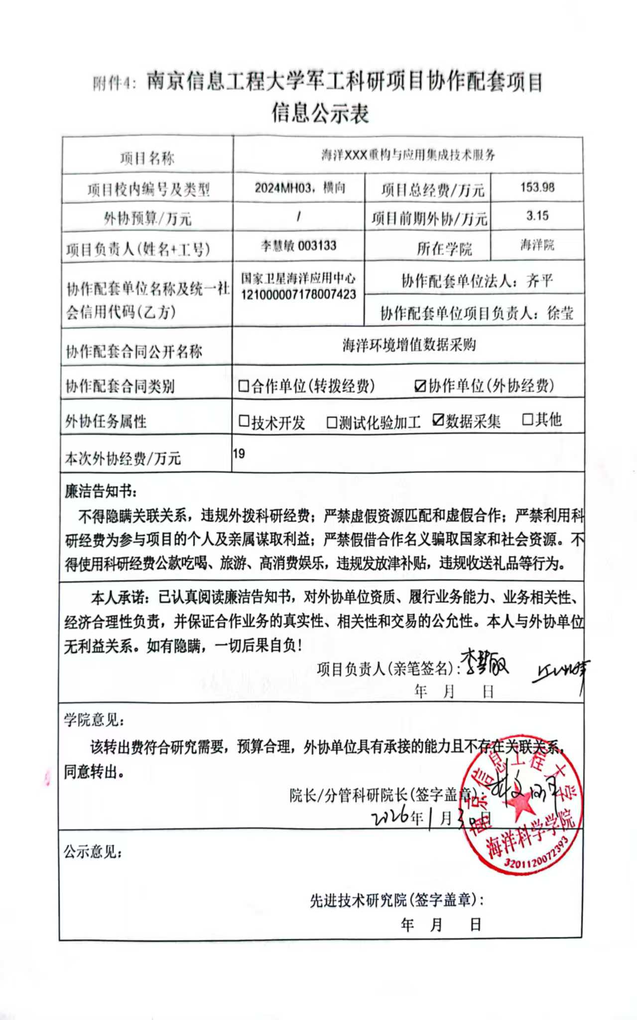 根据《南京信息工程大学科研经费管理办法(修订)》(校发〔2025〕66号)、《南京信息工程大学科研项目及经费管理办法》(校发〔2025〕81号)和我校科研项目外协经费管理要求,现对海洋科学学院李慧敏教师军工项目(2024mh03)的拟外协项目有关情况进行公示。公示时间:2026年3月1日至2026年3月9日。